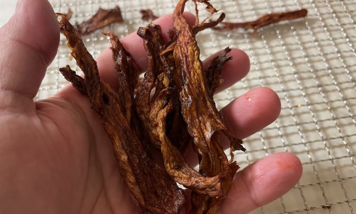 Domácí jerky z hlívy ústřičné. V mnohém předčí maso a příprava je jednoduchá